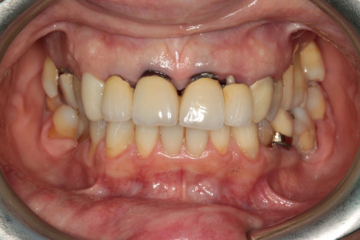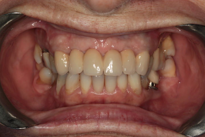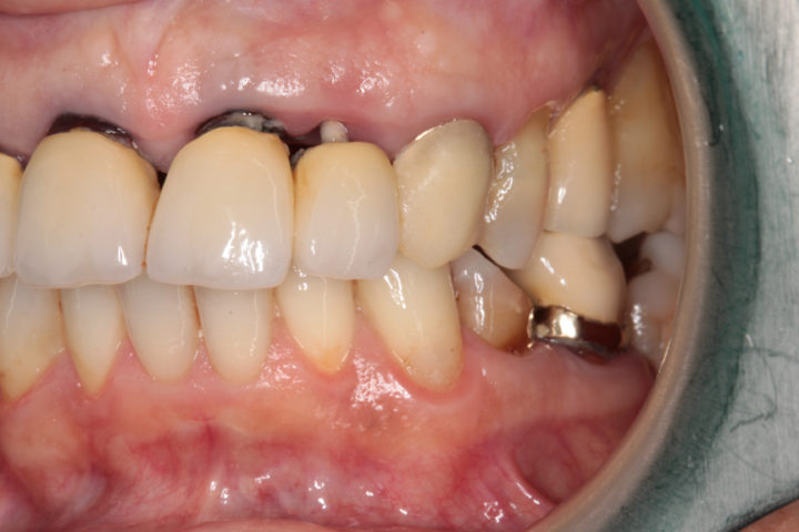 Rimozione del ponte esistente con monconi cariati, esecuzione di estrazioni dentarie mirate, rigenerazione ossea guidata, e completamento del trattamento con un ponte in ceramica supportato da impianti in titanio.