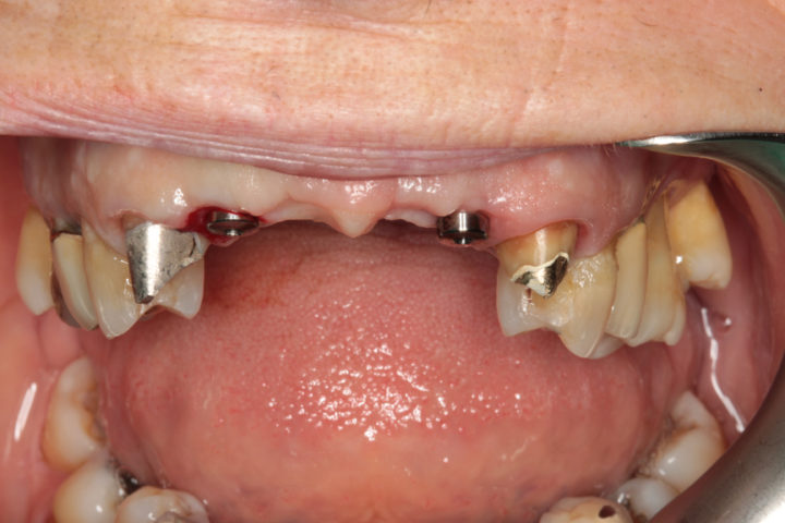 Applicazione di monconi in titanio, che sporgono dalla gengiva e fungono da base per la corona o la protesi
