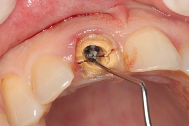 Incisivo superiore gravemente fratturato e non recuperabile. La frattura coinvolge la radice del dente, rendendo necessaria l’estrazione e la sostituzione con un impianto dentale.